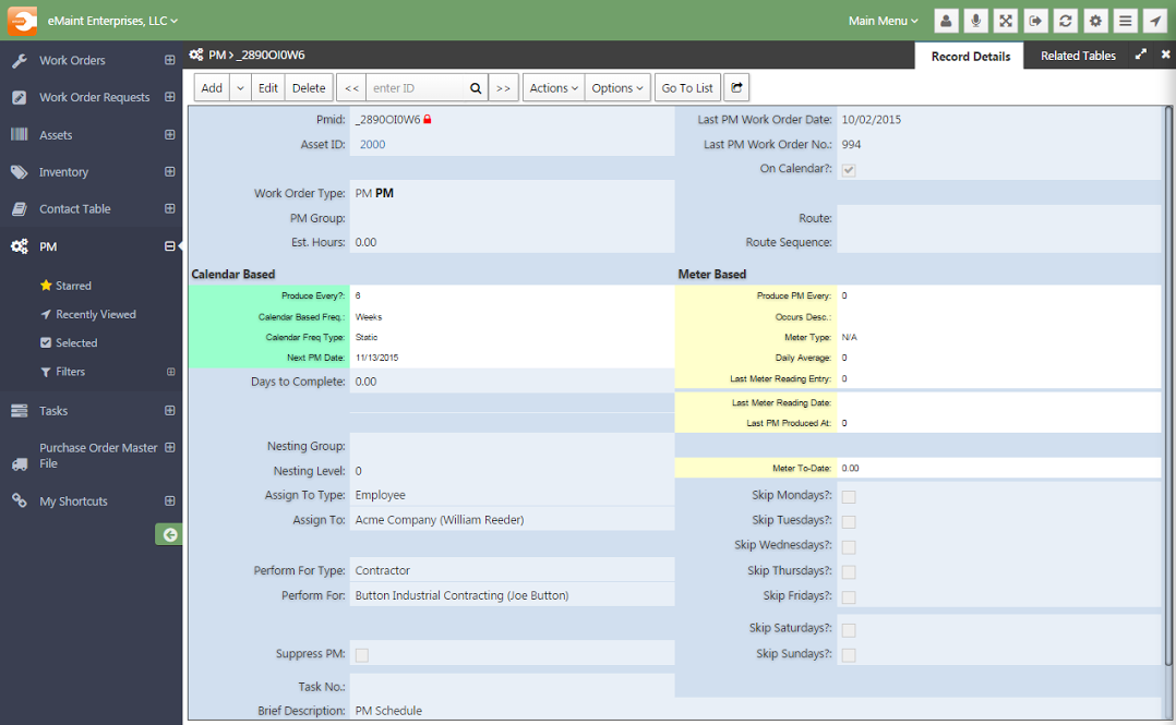 - PM Task Schedules – PM schedules empower users to coordinate labor resources and parts needed to complete work, as well as automatically generate PM tasks based on usage or a daily, weekly or monthly basis.